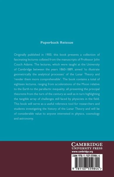 Originally published in 1900, this book presents a collection of fascinating lectures collated from the manuscripts of Professor John Couch Adams. The lectures, which were taught at the University of Cambridge between the years 1860-89, aimed 'to illustrate geometrically the analytical processes' of the Lunar Theory and 'render them more comprehensible'. The book contains a total of eighteen lectures, ranging from accelerations of the Moon relative to the Earth to the parallactic inequality, all presenting the principal theorems from the turn of the century as well as in turn highlighting the tangible array of challenges still faced by physicists in the field. This book will serve as a useful reference tool for researchers and students investigating the history of the Lunar Theory and will be of considerable value to anyone interested in physics, cosmology and astronomy.