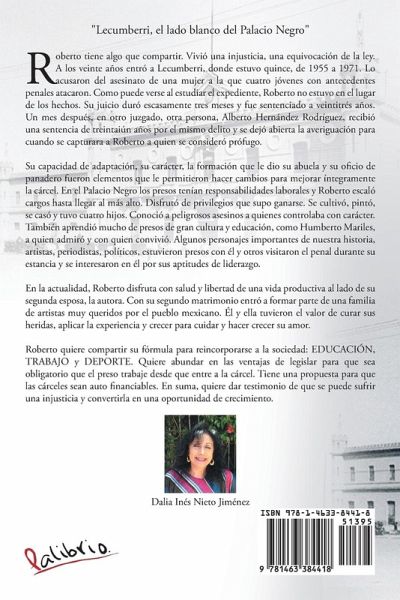 "Lecumberri, el lado blanco del Palacio Negro" Roberto tiene algo que compartir. Vivió una injusticia, una equivocación de la ley. A los veinte años entró a Lecumberri, donde estuvo quince, de 1955 a 1971. Lo acusaron del asesinato de una mujer a la que cuatro jóvenes con antecedentes penales atacaron. Como puede verse al estudiar el expediente, Roberto no estuvo en el lugar de los hechos. Su juicio duró escasamente tres meses y fue sentenciado a veintitrés años. Un mes después, en otro juzgado, otra persona, Alberto Hernández Rodríguez, recibió una sentencia de treintaiún años por el mismo delito y se dejó abierta la averiguación para cuando se capturara a Roberto a quien se consideró prófugo. Su capacidad de adaptación, su carácter, la formación que le dio su abuela y su oficio de panadero fueron elementos que le permitieron hacer cambios para mejorar íntegramente la cárcel. En el Palacio Negro los presos tenían responsabilidades laborales y Roberto escaló cargos hasta llegar al más alto. Disfrutó de privilegios que supo ganarse. Se cultivó, pintó, se casó y tuvo cuatro hijos. Conoció a peligrosos asesinos a quienes controlaba con carácter. También aprendió mucho de presos de gran cultura y educación, como Humberto Mariles, a quien admiró y con quien convivió. Algunos personajes importantes de nuestra historia, artistas, periodistas, políticos, estuvieron presos con él y otros visitaron el penal durante su estancia y se interesaron en él por sus aptitudes de liderazgo. En la actualidad, Roberto disfruta con salud y libertad de una vida productiva al lado de su segunda esposa, la autora. Con su segundo matrimonio entró a formar parte de una familia de artistas muy queridos por el pueblo mexicano. Él y ella tuvieron el valor de curar sus heridas, aplicar la experiencia y crecer para cuidar y hacer crecer su amor. Roberto quiere compartir su fórmula para reincorporarse a la sociedad: EDUCACIÓN, TRABAJO y DEPORTE. Quiere abundar en las ventajas de legislar para que sea obligatorio que el preso trabaje desde que entre a la cárcel. Tiene una propuesta para que las cárceles sean auto financiables. En suma, quiere dar testimonio de que se puede sufrir una injusticia y convertirla en una oportunidad de crecimiento. Dalia Inés Nieto Jiménez