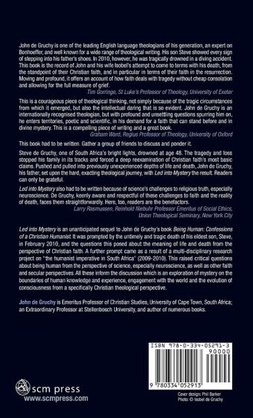Led into Mystery is an unanticipated sequel to John de Gruchy's book Being Human: Confessions of a Christian Humanist. It was prompted by the untimely and tragic death of his eldest son, Steve, in February 2010, and the questions this posed about the meaning of life and death from the perspective of Christian faith. A further prompt came as a result of a multi-disciplinary research project on ""the humanist imperative in South Africa"" (2009-2010). This raised critical questions about being human from the perspective of science, especially neuroscience, as well as other faith and secular perspectives. All these inform the discussion which is an exploration of mystery on the boundaries of human knowledge and experience, engagement with the world and the evolution of consciousness from a specifically Christian theological perspective. The title derives from Karl Rahner's comment that theology is about being led back into mystery -- the ultimate mystery of God disclosed in the life, death and resurrection of Jesus and the creative presence of the Spirit in the life of the world. This mystery is an open secret waiting to be explored, expressed and entered into by faith. In doing so, we discern the fragmentary mystery of being human alone and in relationship within the constraints of our time and space. We are rudely encountered by the perplexing mysteries of evil and death, but embraced by the mysteries of goodness and beauty, hope and love. We draw on memory and imagination to develop a language that enables us to explore mystery through the genre of myth, parable, poetry, the novel, music and art, we participate in the mysteries of faith that communicate grace, forgiveness, and freedom which enable us to be more fully human in the life of the world in the struggles for justice and peace.