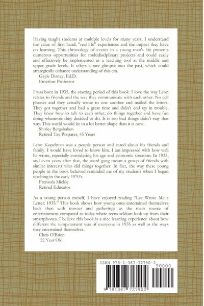 Lee Wrote Me A Letter is a peek into the life of a teenager from 1934 to 1935 during the Great Depression. This book also displays the art of letter writing, an art that is all but gone in this day and age of smart phones and tablets. Lee Wrote Me A Letter is valuable for educators in that it can be applied as a teaching tool in the classroom to better understand this era in American life. There is nothing in this book that can't be read by students in elementary, middle and high school. And yet, it holds an interest for adults of all ages. If something even cleaner than a "G" rating existed, this book would receive it.
