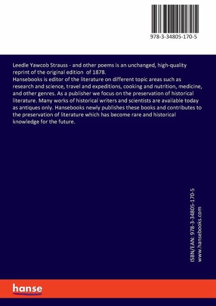 Leedle Yawcob Strauss - and other poems is an unchanged, high-quality reprint of the original edition of 1878.Hansebooks is editor of the literature on different topic areas such as research and science, travel and expeditions, cooking and nutrition, medicine, and other genres. As a publisher we focus on the preservation of historical literature. Many works of historical writers and scientists are available today as antiques only. Hansebooks newly publishes these books and contributes to the preservation of literature which has become rare and historical knowledge for the future.