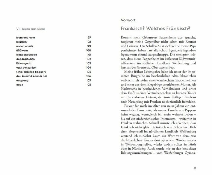 Das Fränkische wird für den Autor dabei zum idealen Ausdrucksmittel: »Das ist ja auch das Wunderbare am Dialekt: Seine Vielfalt und Wandlungsfähigkeit, seine treffsicheren Ausdrucksmöglichkeiten.«