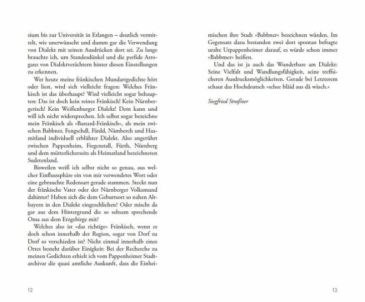 77 fränkische Mundartgedichte moderne Dialektlyrik mit Hintergedanken. Straßners Gedichte zielen direkt ins Leben unverfroren, sensibel und todernst komisch.