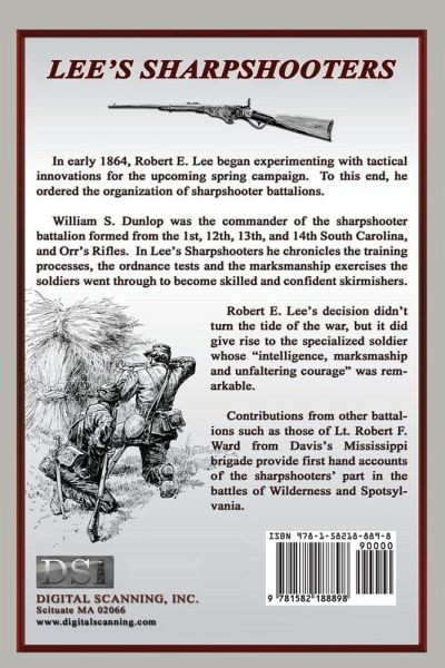In early 1864, Robert E. Lee began experimenting with tactical innovations for the upcoming spring campaign. To this end, he ordered the organization of sharpshooter battalions. William S. Dunlop was the commander of the sharpshooter battalion formed from the 1st, 12th, 13th, and 14th South Carolina, and Orr's Rifles. In Lee's Sharpshooters he chronicles the training processes, the ordnance tests and the marksmanship exercises the soldiers went through to become skilled and confident skirmishers. Robert E. Lee's decision didn't turn the tide of the war, but it did give rise to the specialized soldier whose " intelligence, marksmanship and unfaltering courage" was remarkable. Contributions from other battalions such as those of Lt. Robert F. Ward from Davis's Mississippi brigade provide first hand accounts of the sharpshooters' part in the battles of Wilderness and Spotsylvania.