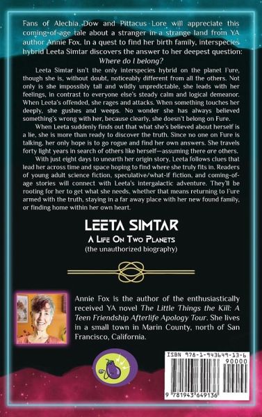 "In a universe governed by controlled narratives and cultural erasure, Fox delivers an empowering reminder to embrace individuality and dare to fight for change." -BookLife by Publishers Weekly (Editor's Pick)"A rousing tale about a young woman coming to terms with an unresolved past." -Kirkus Reviews For fans of Alechia Dow and Pittacus Lore comes Leeta Simtar: A Life on Two Planets-the latest book from young adult author Annie Fox about an interspecies hybrid looking to find herself on a new planet. A coming-of-age story that explores the meaning of birth family and found family, Leeta Simtar shows readers how breaking out of the past can help us figure out where we're going next. Leeta Simtar isn't the only interspecies hybrid on the planet Fure, though she is, without a doubt, noticeably different from all the others. Not only is she impossibly tall and wildly unpredictable, she leads with her feelings, in contrast to everyone else's steady calm and logical demeanor. When Leeta's offended, she rages and attacks. When something touches her deeply, she gushes and weeps. No wonder she has always believed something's wrong with her, because clearly, she doesn't belong on Fure. When Leeta suddenly finds out that what she's believed about herself is a lie, she is more than ready to discover the truth. Since no one on Fure is talking, her only hope is to go rogue and find her own answers. She travels forty light years in search of others like herself-assuming there are others. With just eight days to unearth her origin story, Leeta follows clues that lead her across time and space hoping to find where she truly belongs. Readers of young adult science fiction, speculative/what-if fiction, and coming-of-age stories will connect to Leeta's intergalactic adventure. They'll be rooting for her to get what she needs, whether that means returning to Fure armed with the truth, staying in a far away place with her new found family, or finding home within her own heart.