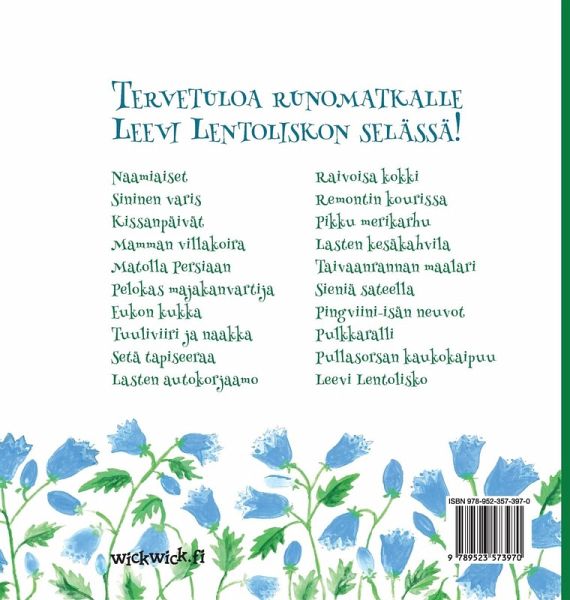 Tervetuloa runomatkalle Leevi Lentoliskon selässä! Mukana vauhdissa ovat seuraavat runot: Naamiaiset Sininen varis Kissanpäivät Mamman villakoira Matolla Persiaan Pelokas majakanvartija Eukon kukka Tuuliviiri ja naakka Setä tapiseeraa Lasten autokorjaamo Raivoisa kokki Remontin kourissa Pikku merikarhu Lasten kesäkahvila Taivaanrannan maalari Sieniä sateella Pingviini-isän neuvot Pulkkaralli Pullasorsan kaukokaipuu Leevi Lentolisko