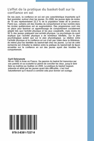 De nos jours, la confiance en soi est une caractéristique importante qu il faut posséder, surtout chez les jeunes. En 2006, les jeunes âgés de moins de 19 ans représentaient 22,3 % de la population totale de la province. Parmi eux, certains ont des troubles du comportement et leur nombre dans les écoles québécoises est en augmentation. Des programmes sont mis en place pour favoriser un apprentissage de comportement socialement adapté tels que l activité physique et les jeux coopératifs, mais moins de 50 % des jeunes pratiquent une activité physique. La psychologie du sport explique que l activité physique a de nombreux bienfaits, sur le plan psychologique autant que sur le plan physiologique. La relation entre l activité physique et la confiance en soi n est pas claire dans la littérature, de même pour les bienfaits du basket-ball chez les jeunes. Le but de cette recherche est d étudier la relation entre la pratique du basket-ball de façon encadrée sur la confiance en soi des jeunes ayant des troubles du comportement.
