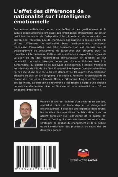 Des études antérieures portant sur l'efficacité des gestionnaires et la culture organisationnelle ont établi que l'intelligence émotionnelle (IE) est un prédicteur essentiel de l'adaptation interculturelle et de la réussite des entreprises. Toutefois, peu de chercheurs ont examiné la relation entre l'IE et les différences de nationalité. Dans l'environnement commercial mondialisé d'aujourd'hui, une telle compréhension est cruciale pour le développement de programmes de leadership plus efficaces pour les travailleurs internationaux. Cette étude quantitative a exploré les degrés de variation de l'IE des responsables d'organisation en fonction de leur nationalité. Un cadre théorique, fourni par plusieurs théories liées à la personnalité, au leadership et aux types d'intelligence, a permis d'analyser les résultats de l'étude. Le Trait Emotional Intelligence Questionnaire-Short Form a été utilisé pour recueillir des données sur l'IE auprès d'un échantillon aléatoire de plus de 200 dirigeants d'entreprise. Au moins 40 participants de chacun des cinq pays - Canada, Mexique, Slovaquie, Turquie et États-Unis - ont été inclus. La question de recherche a été testée à l'aide d'une analyse de variance afin de déterminer le rôle éventuel de la nationalité dans l'IE des dirigeants d'entreprise.