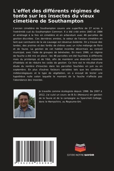 L'ancien cimetière de Southampton couvre une superficie de 27 acres à l'extrémité sud du Southampton Common. Il a été créé entre 1843 et 1884 et aménagé à la fois en cimetière et en arboretum avec 46 parcelles de gestion discrètes. Ces dernières années, la valeur de l'ancien cimetière en tant que sanctuaire de la vie sauvage est devenue évidente. On y trouve des landes, des prairies et des forêts de chênes avec un riche mélange de flore et de faune. La gestion de cet habitat incombe désormais au conseil municipal, avec l'aide de groupes de bénévoles. En mars 1990, un régime de fauche a été mis en place : les 46 parcelles ont été fauchées à différents mois du printemps et de l'été, afin de maintenir une diversité maximale d'habitats et de réduire les coûts de gestion. Ce livre est le résultat d'une étude du nombre d'insectes dans les parcelles fauchées en juin ou en septembre. En plus d'autres facteurs variables tels que les conditions météorologiques et le type de végétation, on a essayé de tester une hypothèse nulle selon laquelle le moment de la fauche n'affecte pas l'abondance des insectes.
