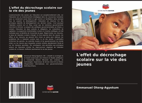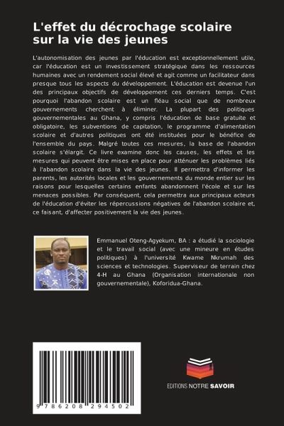 L'autonomisation des jeunes par l'éducation est exceptionnellement utile, car l'éducation est un investissement stratégique dans les ressources humaines avec un rendement social élevé et agit comme un facilitateur dans presque tous les aspects du développement. L'éducation est devenue l'un des principaux objectifs de développement ces derniers temps. C'est pourquoi l'abandon scolaire est un fléau social que de nombreux gouvernements cherchent à éliminer. La plupart des politiques gouvernementales au Ghana, y compris l'éducation de base gratuite et obligatoire, les subventions de capitation, le programme d'alimentation scolaire et d'autres politiques ont été instituées pour le bénéfice de l'ensemble du pays. Malgré toutes ces mesures, la base de l'abandon scolaire s'élargit. Ce livre examine donc les causes, les effets et les mesures qui peuvent être mises en place pour atténuer les problèmes liés à l'abandon scolaire dans la vie des jeunes. Il permettra d'informer les parents, les autorités locales et les gouvernements du monde entier sur les raisons pour lesquelles certains enfants abandonnent l'école et sur les menaces possibles. Par conséquent, cela permettra aux principaux acteurs de l'éducation d'éviter les répercussions négatives de l'abandon scolaire et, ce faisant, d'affecter positivement la vie des jeunes.