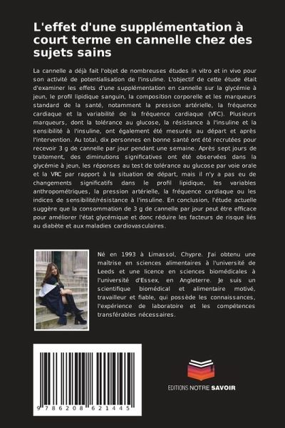 La cannelle a déjà fait l'objet de nombreuses études in vitro et in vivo pour son activité de potentialisation de l'insuline. L'objectif de cette étude était d'examiner les effets d'une supplémentation en cannelle sur la glycémie à jeun, le profil lipidique sanguin, la composition corporelle et les marqueurs standard de la santé, notamment la pression artérielle, la fréquence cardiaque et la variabilité de la fréquence cardiaque (VFC). Plusieurs marqueurs, dont la tolérance au glucose, la résistance à l'insuline et la sensibilité à l'insuline, ont également été mesurés au départ et après l'intervention. Au total, dix personnes en bonne santé ont été recrutées pour recevoir 3 g de cannelle par jour pendant une semaine. Après sept jours de traitement, des diminutions significatives ont été observées dans la glycémie à jeun, les réponses au test de tolérance au glucose par voie orale et la VRC par rapport à la situation de départ, mais il n'y a pas eu de changements significatifs dans le profil lipidique, les variables anthropométriques, la pression artérielle, la fréquence cardiaque ou les indices de sensibilité/résistance à l'insuline. En conclusion, l'étude actuelle suggère que la consommation de 3 g de cannelle par jour peut être efficace pour améliorer l'état glycémique et donc réduire les facteurs de risque liés au diabète et aux maladies cardiovasculaires.