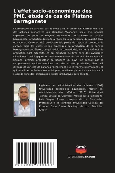 La production de bananes barraganete dans le canton d'El Carmen est l'une des activités productives qui stimulent l'économie locale d'un nombre important de petits et moyens agriculteurs qui cultivent la banane barraganete, production destinée à répondre à la demande du marché local et national. Cette activité productive fait partie de l'appareil productif du canton, mais les coûts et les processus de production de la banane barraganete sont élevés, ce qui réduit la compétitivité, car les systèmes de production sont extensifs, ce qui empêche de tirer parti des avantages climatiques, pédologiques et environnementaux du secteur. Le canton d'El Carmen, premier producteur de bananes du pays, ne connaît pas le comportement socio-économique de cette activité productive, bien qu'il dispose de variétés de bananes recherchées sur le marché international, ce qui constitue un facteur essentiel pour le développement du canton car il s'agit de l'une des principales activités productives de la localité.