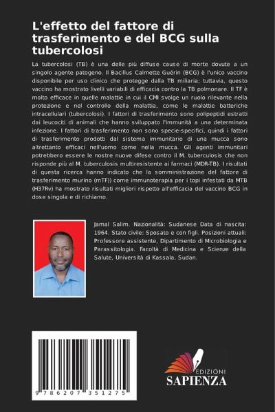 La tubercolosi (TB) è una delle più diffuse cause di morte dovute a un singolo agente patogeno. Il Bacillus Calmette Guérin (BCG) è l'unico vaccino disponibile per uso clinico che protegge dalla TB miliaria; tuttavia, questo vaccino ha mostrato livelli variabili di efficacia contro la TB polmonare. Il TF è molto efficace in quelle malattie in cui il CMI svolge un ruolo rilevante nella protezione e nel controllo della malattia, come le malattie batteriche intracellulari (tubercolosi). I fattori di trasferimento sono polipeptidi estratti dai leucociti di animali che hanno sviluppato l'immunità a una determinata infezione. I fattori di trasferimento non sono specie-specifici, quindi i fattori di trasferimento prodotti dal sistema immunitario di una mucca sono altrettanto efficaci nell'uomo come nella mucca. Gli agenti immunitari potrebbero essere le nostre nuove difese contro il M. tuberculosis che non risponde più al M. tuberculosis multiresistente ai farmaci (MDR-TB). I risultati di questa ricerca hanno indicato che la somministrazione del fattore di trasferimento murino (mTF)) come immunoterapia per i topi infestati da MTB (H37Rv) ha mostrato risultati migliori rispetto all'efficacia del vaccino BCG in dose singola e di richiamo.
