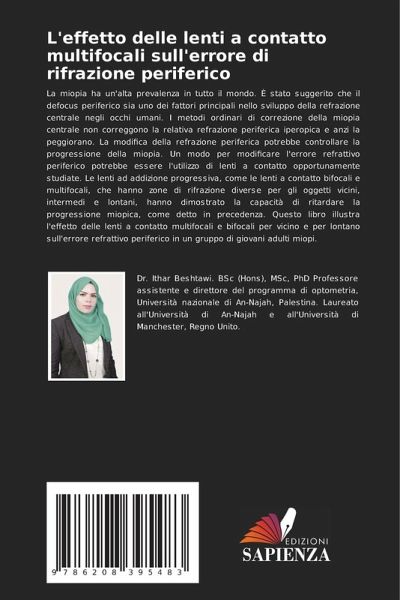 La miopia ha un'alta prevalenza in tutto il mondo. È stato suggerito che il defocus periferico sia uno dei fattori principali nello sviluppo della refrazione centrale negli occhi umani. I metodi ordinari di correzione della miopia centrale non correggono la relativa refrazione periferica iperopica e anzi la peggiorano. La modifica della refrazione periferica potrebbe controllare la progressione della miopia. Un modo per modificare l'errore refrattivo periferico potrebbe essere l'utilizzo di lenti a contatto opportunamente studiate. Le lenti ad addizione progressiva, come le lenti a contatto bifocali e multifocali, che hanno zone di rifrazione diverse per gli oggetti vicini, intermedi e lontani, hanno dimostrato la capacità di ritardare la progressione miopica, come detto in precedenza. Questo libro illustra l'effetto delle lenti a contatto multifocali e bifocali per vicino e per lontano sull'errore refrattivo periferico in un gruppo di giovani adulti miopi.