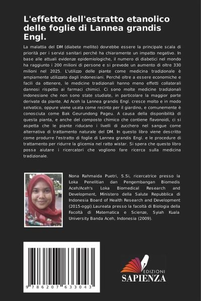 La malattia del DM (diabete mellito) dovrebbe essere la principale scala di priorità per i servizi sanitari perché ha chiaramente un impatto negativo. In base alle attuali evidenze epidemiologiche, il numero di diabetici nel mondo ha raggiunto i 200 milioni di persone e si prevede un aumento di oltre 330 milioni nel 2025. L'utilizzo delle piante come medicina tradizionale è ampiamente utilizzato dagli indonesiani. Perché oltre a essere economiche e facili da ottenere, le medicine tradizionali hanno meno effetti collaterali dannosi rispetto ai farmaci chimici. Ci sono molte medicine tradizionali indonesiane che non sono state studiate, in particolare la maggior parte derivate da piante. Ad Aceh la Lannea grandis Engl. cresce molto e in modo selvatico, oppure viene usata come recinto per il giardino, e comunemente è conosciuta come Bak Geurundong Pageu. A causa della disponibilità di questa pianta, e anche del composto chimico che contiene flavonoidi, ci si aspetta che le piante riducano i livelli di zucchero nel sangue come alternativa di trattamento naturale del DM. In questo libro viene descritto come produrre l'estratto di foglie di Lannea grandis Engl. e le procedure di trattamento per ridurre la glicemia nel ratto wistar. Si spera che questo libro possa aiutare i ricercatori che vogliono fare ricerca sulla medicina tradizionale.