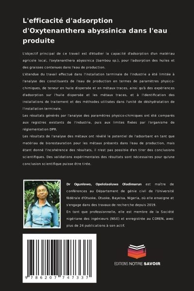 L'objectif principal de ce travail est d'étudier la capacité d'adsorption d'un matériau agricole local, l'oxytenanthera abyssinica (bambou sp.), pour l'adsorption des huiles et des graisses contenues dans l'eau de production.L'étendue du travail effectué dans l'installation terminale de l'industrie a été limitée à l'analyse des constituants de l'eau de production en termes de paramètres physico-chimiques, de teneur en huile dispersée et en métaux traces, ainsi qu'à des expériences d'adsorption sur l'huile dispersée et les métaux traces, et à l'identification des installations de traitement et des méthodes utilisées dans l'unité de déshydratation de l'installation terminale.Les résultats générés par l'analyse des paramètres physico-chimiques ont été comparés aux registres existants de l'industrie, puis aux limites fixées par l'organisme de réglementation DPR.Les résultats de l'analyse des métaux ont révélé le potentiel de l'adsorbant en tant que matériau de biorestauration pour les métaux présents dans l'eau de production, mais étant donné l'incohérence des résultats, il n'est pas possible d'en tirer des conclusions scientifiques. Des validations expérimentales des résultats sont nécessaires pour qu'une conclusion scientifique puisse être tirée.