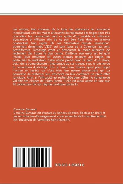Les raisons, bien connues, de la fuite des opérateurs du commerce international vers les modes alternatifs de règlement des litiges sont très concrètes: les contractants sont en quête d'un modèle de référence dynamique et efficace afin de ne pas être figés dans un schéma contractuel trop rigide. Or ces "alternative dispute resolution", autrement denommés "ADR" qui sont issus de la Common law sont protéiformes, l'arbitrage étant et demeurant le mode alternatif de règlement des litiges le plus connu. D'ailleurs son essor est tel qu'il irradie, qu'il influence les autres clauses relatives aux litiges, en particulier la médiation. Cette étude prend donc le parti d'un choix, celui de la compréhension théorétique de ces clauses sous le prisme de la convention d'arbitrage. Elle se limite aux clauses ayant pour objet l'action en justice car c'est bien leur nature processuelle qui va permettre de renforcer leur efficacité en leur conférant un plein effet juridique. Ainsi, si l'efficacité est recherchée pour définir le domaine de validité des clauses de litiges (partie I),elle est aussi usitée en tant que fil conducteur de leur régime juridique (partie II).