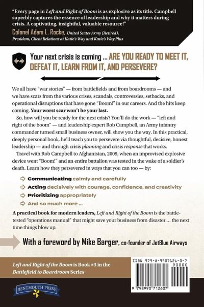 "Powerful stories and proven practices for surviving and thriving when things blow up. A story of war and leadership under the most extreme conditions, with poignant lessons applicable to your business." From the Battlefield to the Boardroom The truth of the matter is that in any kind of organization - military or civilian - things can blow up. And when they do - when that crisis comes - you'll want to meet it, defeat it, learn from it, and persevere. The only way to do that is through thoughtful, decisive, honest leadership - and through crisis planning and crisis response that works. Travel with Rob Campbell to Afghanistan, 2009, when an improvised explosive device (IED) went "Boom!" and an entire battalion was tested in the wake of a soldier's death. Learn how they persevered in ways that you can too - by: Communicating calmly and carefully Acting decisively with courage, confidence, and creativity Prioritizing appropriately And so much more ... A Practical Book for Modern Leaders How is a great business leader like a good military commander? They go on the offensive, knowing "defense never wins." The offense is characterized by initiative, tenacity, and opportunity. It means, quite simply, getting off your duff - stepping forward and moving toward threats to find them, fix them, and finish them. In times of crisis, it's imperative that we turn not to emotions and erratic thought but to reason, principles, values, and training. This book teaches you how. Left and Right of the Boom helps leaders at all levels and in all industries get their arms around the complexities of leading organizations through high-stakes change and crisis. Instructive scenarios and real-life examples help the reader understand the crisis-management concepts, so they'll be ready when the time comes. Boom! Complete with Battlefield Tips and Reflection Questions to help you take the learning from the theoretical to the practical. This book is about action and it's about now. And it's for you. With a foreword by Mike Barger, co-founder of JetBlue Airways. Left and Right of the Boom is Book #3 in the Battlefield to Boardroom Series.