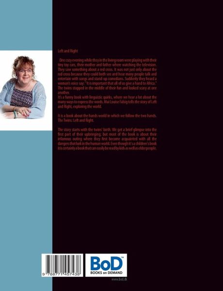 Left and RightOne cozy evening while they in the living room were playing with their tiny toy cars, their mother and father where watching the television. They saw something about a red cross. It was not just only about the red cross because they could both see and hear many people talk and entertain with songs and stand-up comedians. Suddenly they heard a woman's voice say: "It is important that all of us give a hand to Africa." The twins stopped in the middle of their fun and looked scary at one another. It's a funny book with linguistic quirks, where we hear a lot about the many ways to express the words. Mai Louise Falsig tells the story of Left and Right, exploring the world. It is a book about the hands world in which we follow the two hands. The Twins: Left and Right. The story starts with the twins' birth. We get a brief glimpse into the first part of their upbringing; but most of the book is about their infamous outing where they first become acquainted with all the dangers that lurk in the human world. Even though it's a children's book it is certainly a book that can easily be read by kids as well as elder people.