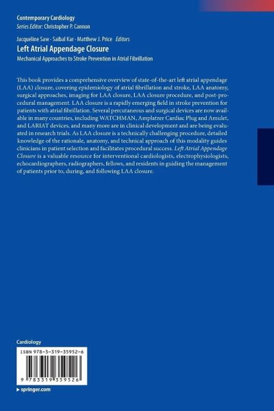 Atrial fibrillation and stroke epidemiology.- Efficacy and limitations of warfarin, and novel oral anticoagulants with AF.- Mechanistic rationale for LAA closure with AF and stroke prevention.- LAA anatomy.- Conventional surgery for LAA closure.- The use of transesophageal echocardiography to guide percutaneous LAA closure.- The use of intracardiac echocardiography to guide procedural LAA closure.- The use of cardiac CTA to guide percutaneous LAA closure.- PLAATO device.- WATCHMAN device.- WATCHMAN: Trials and registries results.- Amplatzer Cardiac Plug (ACP) and Amulet.- ACP and Amulet: Trials and registries results.- LARIAT.- LARIAT: Trials and registries results.- Novel percutaneous LAA closure devices in clinical or pre-clinical trials.- Concomitant AF ablation and LAA closure.- Procedural complications and management.- Antiplatelet and anticoagulant strategies after LAA closure.- Device-related thrombi, residual leaks and consequences.