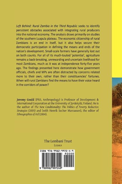 Left Behind: Rural Zambia in the Third Republic seeks to identify persistent obstacles associated with integrating rural producers into the national economy. The analysis draws primarily on studies of the southern Luapula plateau. The economic citizenship of rural Zambians is an end in itself, but it also helps secure their democratic participation in defining the means and ends of the nation's development. Small-scale farmers have generally lost out on both counts. For all of its much-touted 'potential', agriculture remains a back-breaking, unrewarding and uncertain livelihood for most Zambians, much as it was at independence forty-five years ago. The findings presented here demonstrate how government officials, chiefs and MPs are often distracted by concerns related more to their own, rather than their constituencies' fortunes. When will rural Zambians find the means to have their voice heard in the corridors of power?