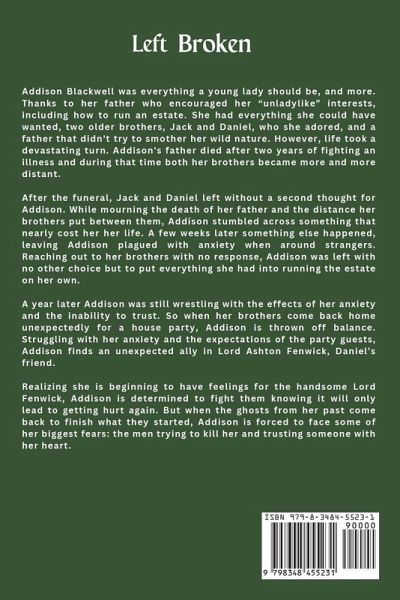 Addison Blackwell was everything a young lady should be, and more. Thanks to her father who encouraged her "unladylike" interests, including how to run an estate. She had everything she could have wanted, two older brothers, Jack and Daniel, who she adored, and a father that didn't try to smother her wild nature. However, life took a devastating turn. Addison's father died after two years of fighting an illness and during that time both her brothers became more and more distant. After the funeral, Jack and Daniel left without a second thought for Addison. While mourning the death of her father and the distance her brothers put between them, Addison stumbled across something that nearly cost her her life. A few weeks later something else happened, leaving Addison plagued with anxiety when around strangers. Reaching out to her brothers with no response, Addison was left with no other choice but to put everything she had into running the estate on her own. A year later Addison was still wrestling with the effects of her anxiety and the inability to trust. So when her brothers come back home unexpectedly for a house party, Addison is thrown off balance. Struggling with her anxiety and the expectations of the party guests, Addison finds an unexpected ally in Lord Ashton Fenwick, Daniel's friend. Realizing she is beginning to have feelings for the handsome Lord Fenwick, Addison is determined to fight them knowing it will only lead to getting hurt again. But when the ghosts from her past come back to finish what they started, Addison is forced to face some of her biggest fears: the men trying to kill her and trusting someone with her heart.
