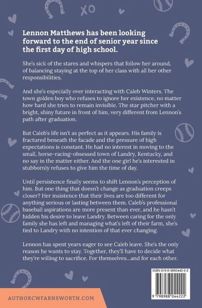Lennon Matthews has been looking forward to the end of senior year since the first day of high school. She's sick of the stares and whispers that follow her around, of balancing staying at the top of her class with all her other responsibilities. And she's especially over interacting with Caleb Winters. The town golden boy who refuses to ignore her existence, no matter how hard she tries to remain invisible. The star pitcher with a bright, shiny future in front of him, very different from Lennon's path after graduation. But Caleb's life isn't as perfect as it appears. His family is fractured beneath the facade and the pressure of high expectations is constant. He had no interest in moving to the small, horse-racing-obsessed town of Landry, Kentucky, and no say in the matter either. And the one girl he's interested in stubbornly refuses to give him the time of day. Until persistence finally seems to shift Lennon's perception of him. But one thing that doesn't change as graduation creeps closer? Her insistence that their lives are too different for anything serious or lasting between them. Caleb's professional baseball aspirations are more present than ever, and he hasn't hidden his desire to leave Landry. Between caring for the only family she has left and managing what's left of their farm, she's tied to Landry with no intention of that ever changing. Lennon has spent years eager to see Caleb leave. She's the only reason he wants to stay. Together, they'll have to decide what they're willing to sacrifice. For themselves...and for each other.