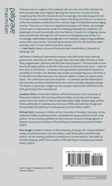 From Pariahs To Players? Left Parties In National Government; J.Olsen , D.Hough & M.Ko? The Norwegian Socialist Left Party; Office-Seekers in the Service of Policy?; J.Olsen The French Extreme Left and its Suspicion of Power; D.Bell Between a Rock and a Hard Place; The Governing Dilemmas of Rifondazione Comunista; J.Newell A Poisoned Chalice? Finland's Left Alliance and the Perils of Government; R.Dunphy The Spanish United Left - The Belated and Troublesome Transition from Policy- to Office-Seeking; T.Verge Close to, but Still Out of, Government; The Swedish Vänsterpartiet; M.Koß The Danish Socialist People's Party; Still Waiting After All These Years; D.A.Christensen From Pariah to Prospective Partner? The German Left Party's Winding Path Towards Government; D.Hough Ready to Get Their Hands Dirty; The Socialist Party and Groenlinks in the Netherlands; D.Keith Conclusion. Left Parties in National Governments; J.Olsen , D.Hough & M.Ko?