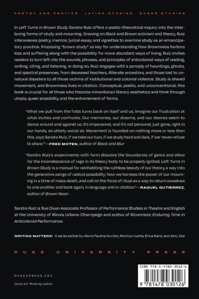 In Left Turns in Brown Study Sandra Ruiz offers a poetic-theoretical inquiry into the interlacing forms of study and mourning. Drawing on Black and Brown activism and theory, Ruiz interweaves poetry, memoir, lyrical essay, and vignettes to examine study as an emancipatory practice. Proposing "brown study" as key for understanding how Brownness harbors loss and suffering along with the possibility for more abundant ways of living, Ruiz invites readers to turn left into the sounds, phrases, and principles of anticolonial ways of reading, writing, citing, and listening. In doing so, Ruiz engages with a panoply of hauntings, ghosts, and spectral presences, from deceased teachers, illiterate ancestors, and those lost to unnatural disasters to all those victims of institutional and colonial violence. Study is shared movement and Brownness lives in citation. Conceptual, poetic, and unconventional, this book is crucial for all those who theorize minoritarian literary aesthetics and think through utopia, queer possibility, and the entwinement of forms.