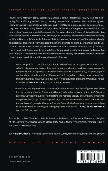 In Left Turns in Brown Study Sandra Ruiz offers a poetic-theoretical inquiry into the interlacing forms of study and mourning. Drawing on Black and Brown activism and theory, Ruiz interweaves poetry, memoir, lyrical essay, and vignettes to examine study as an emancipatory practice. Proposing "brown study" as key for understanding how Brownness harbors loss and suffering along with the possibility for more abundant ways of living, Ruiz invites readers to turn left into the sounds, phrases, and principles of anticolonial ways of reading, writing, citing, and listening. In doing so, Ruiz engages with a panoply of hauntings, ghosts, and spectral presences, from deceased teachers, illiterate ancestors, and those lost to unnatural disasters to all those victims of institutional and colonial violence. Study is shared movement and Brownness lives in citation. Conceptual, poetic, and unconventional, this book is crucial for all those who theorize minoritarian literary aesthetics and think through utopia, queer possibility, and the entwinement of forms.