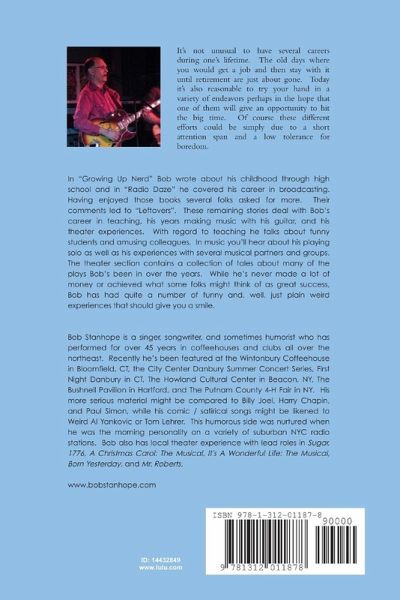 In "Growing Up Nerd" Bob wrote about his childhood through high school and in "Radio Daze" he covered his career in broadcasting. Having enjoyed those books several folks asked for more. Their comments led to "Leftovers". These remaining stories deal with Bob's career in teaching, his years making music with his guitar, and his theater experiences. With regard to teaching he talks about funny students and amusing colleagues. In music you'll hear about his playing solo as well as his experiences with several musical partners and groups. The theater section contains a collection of tales about many of the plays Bob's been in over the years. While he's never made a lot of money or achieved what some folks might think of as great success, Bob has had quite a number of funny and, well, just plain weird experiences that should give you a smile.