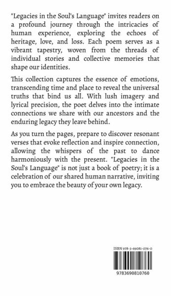 "Legacies in the Soul's Language" invites readers on a profound journey through the intricacies of human experience, exploring the echoes of heritage, love, and loss. Each poem serves as a vibrant tapestry, woven from the threads of individual stories and collective memories that shape our identities. This collection captures the essence of emotions, transcending time and place to reveal the universal truths that bind us all. With lush imagery and lyrical precision, the poet delves into the intimate connections we share with our ancestors and the enduring legacy they leave behind. As you turn the pages, prepare to discover resonant verses that evoke reflection and inspire connection, allowing the whispers of the past to dance harmoniously with the present. "Legacies in the Soul's Language" is not just a book of poetry; it is a celebration of our shared human narrative, inviting you to embrace the beauty of your own legacy.