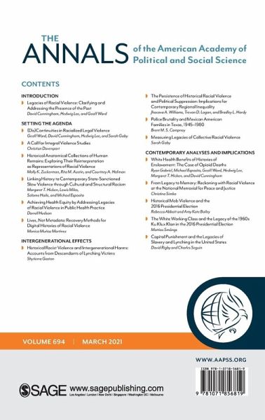 Scholars increasingly agree that histories of racial violence relate to contemporary patterns of conflict and inequality, and growing interest exists among civic leaders in reckoning with these legacies today. This volume of The ANNALS examines the contributions and limitations of scientific research on legacies of racial violence and suggests implications for policy, practice, and other forms of intervention aimed at redress.