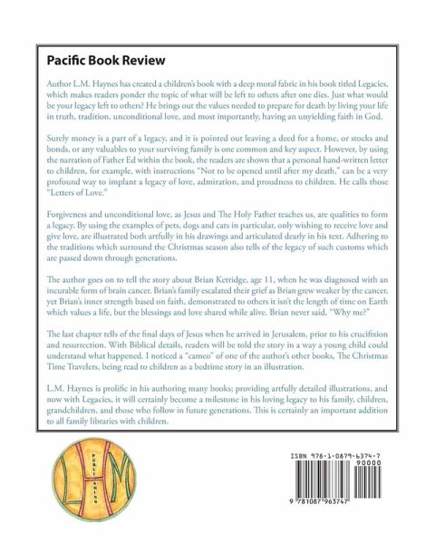 Author L.M. Haynes has created a children's book with a deep moral fabric in his book titled Legacies, which makes readers ponder the topic of what will be left to others after one dies. Just what would be your legacy left to others? He brings out the values needed to prepare for death by living your life in truth, tradition, unconditional love, and most importantly, having an unyielding faith in God. Surely money is a part of a legacy, and it is pointed out leaving a deed for a home, or stocks and bonds, or any valuables to your surviving family is one common and key aspect. However, by using the narration of Father Ed within the book, the readers are shown that a personal hand-written letter to children, for example, with instructions "Not to be opened until after my death," can be a very profound way to implant a legacy of love, admiration, and proudness to children. He calls those "Letters of Love." Forgiveness and unconditional love, as Jesus and The Holy Father teaches us, are qualities to form a legacy. By using the examples of pets, dogs and cats in particular, only wishing to receive love and give love, are illustrated both artfully in his drawings and articulated dearly in his text. Adhering to the traditions which surround the Christmas season also tells of the legacy of such customs which are passed down through generations. The author goes on to tell the story about Brian Ketridge, age 11, when he was diagnosed with an incurable form of brain cancer. Brian's family escalated their grief as Brian grew weaker by the cancer, yet Brian's inner strength based on faith, demonstrated to others it isn't the length of time on Earth which values a life, but the blessings and love shared while alive. Brian never said, "Why me?" The last chapter tells of the final days of Jesus when he arrived in Jerusalem, prior to his crucifixion and resurrection. With Biblical details, readers will be told the story in a way a young child could understand what happened. I noticed a "cameo" of one of the author's other books, The Christmas Time Travelers, being read to children as a bedtime story in an illustration. L.M. Haynes is prolific in his authoring many books; providing artfully detailed illustrations, and now with Legacies, it will certainly become a milestone in his loving legacy to his family, children, grandchildren, and those who follow in future generations. This is certainly an important addition to all family libraries with children.