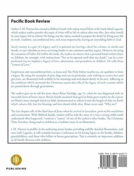 Author L.M. Haynes has created a children's book with a deep moral fabric in his book titled Legacies, which makes readers ponder the topic of what will be left to others after one dies. Just what would be your legacy left to others? He brings out the values needed to prepare for death by living your life in truth, tradition, unconditional love, and most importantly, having an unyielding faith in God. Surely money is a part of a legacy, and it is pointed out leaving a deed for a home, or stocks and bonds, or any valuables to your surviving family is one common and key aspect. However, by using the narration of Father Ed within the book, the readers are shown that a personal hand-written letter to children, for example, with instructions "Not to be opened until after my death," can be a very profound way to implant a legacy of love, admiration, and proudness to children. He calls those "Letters of Love." Forgiveness and unconditional love, as Jesus and The Holy Father teaches us, are qualities to form a legacy. By using the examples of pets, dogs and cats in particular, only wishing to receive love and give love, are illustrated both artfully in his drawings and articulated dearly in his text. Adhering to the traditions which surround the Christmas season also tells of the legacy of such customs which are passed down through generations. The author goes on to tell the story about Brian Ketridge, age 11, when he was diagnosed with an incurable form of brain cancer. Brian's family escalated their grief as Brian grew weaker by the cancer, yet Brian's inner strength based on faith, demonstrated to others it isn't the length of time on Earth which values a life, but the blessings and love shared while alive. Brian never said, "Why me?" The last chapter tells of the final days of Jesus when he arrived in Jerusalem, prior to his crucifixion and resurrection. With Biblical details, readers will be told the story in a way a young child could understand what happened. I noticed a "cameo" of one of the author's other books, The Christmas Time Travelers, being read to children as a bedtime story in an illustration. L.M. Haynes is prolific in his authoring many books; providing artfully detailed illustrations, and now with Legacies, it will certainly become a milestone in his loving legacy to his family, children, grandchildren, and those who follow in future generations. This is certainly an important addition to all family libraries with children.