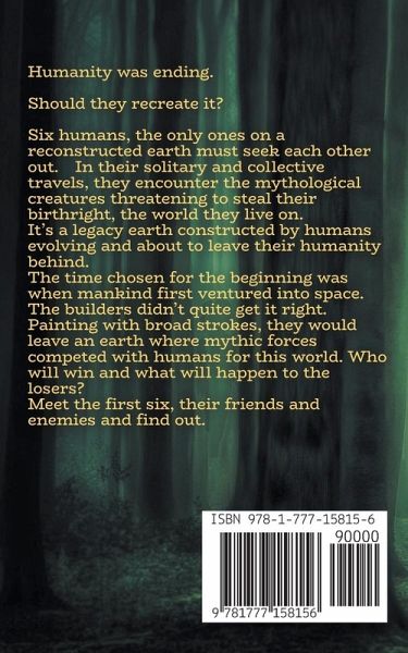 Humanity was ending. Should they recreate it? Six humans, the only ones on a reconstructed earth must seek each other out. In their solitary and collective travels, they encounter the mythological creatures threatening to steal their birthright, the world they live on. It's a legacy earth constructed by humans evolving and about to leave their humanity behind. The time chosen for the beginning was around the time when mankind first went into space. They didn't quite get it right. Painting with broad strokes, they would leave an earth where mythic forces competed with humans for this world. Who will win and what will happen to the losers? Meet the first six, their friends and enemies and find out.
