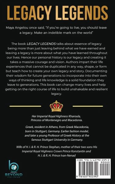 Dear Legacy Builder, I always ask the question, "How will I be remembered?" Your legacy will be shaped by how you act and what you pass down to others, whether at work or at home. This includes not only how you treat and inspire others, but also the financial situation in which you leave your family. Live your life in a way that makes you proud, leave for others with fun memories of you, and ensure a secure future for your family. All good men and women must accept responsibility for leaving legacies that will propel the next generation to heights we can only dream of. With these words on your side, you can begin to build your legacy. The first question is, "How will you define your values, worth, and global need in order to leave this world a better place than you found it? " Whatever your response, begin legacy-building today. Tomorrow will be too late. HRH Stephan Prince of Montenegro "Your story is the greatest legacy that you will leave to your friends. it 's longest lasting legacy you will leave to your heirs" - Steve Saint Your Personal Life is your individual legacy. This is important whether you are single or married, and whether or not you have children. Because who you are as an individual influences every other relationship in your life, we must exercise caution here.It all comes from your heart, whether it's your relationship with your spouse, how you interact with your children, how you run your business, how you manage your money, or how you act around your friends. I learned a long time ago that if I wanted to have quality relationships and leave a lasting legacy, I had to master the man in the mirror. He was the only thing preventing me from moving forward. He was the only one who could undo everything God had planned for me. As you work to protect your legacy, the first and most important area to manage is yourself. COUNTESS Ilona Parunakova Maya Angelou once said, "If you're going to live, you should leave a legacy. Make an indelible mark on the world" The book LEGACY LEGENDS talks about essence of legacy being more than just leaving behind what we have earned and leaving a legacy is more about what you have learned throughout our lives. Hence our personal history is our legacy and creating it takes a massive courage and vision. Authors impart their life experiences that cannot be duplicated in any way, shape, or form but teach how to create your own legacy and story. Documenting their wisdom for future generations to incorporate into their own ways of thinking and life knowledge is a solid foundation they leave to generations. This book can change many lives and help getting on the right course of life to build unshakable and resilient legacy. Her Imperial Royal Highness Kharoula, Princess of Montenegro and Macedonia. Greek, resident in Athens, from Greek Macedonia, born in Stuttgart, Germany. Earlier fashion model, and later a young Professor of Greek History at the famous Stuttgart University in Germany. Wife of H. I. & R. H. Prince Stephan, mother of their two sons His Imperial Royal Highness Crown Prince Konstantin and H. I. & R. H. Prince Ivan-Nenad