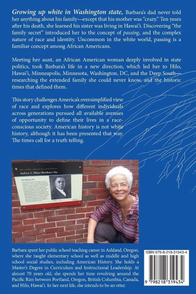 Growing up white in Washington state, Barbara's dad never told her anything about his family-except that his mother was "crazy." Ten years after his death, she learned his sister was living in Hawai'i. Discovering "the family secret" introduced her to the concept of passing, and the complex nature of race and identity. Uncommon in the white world, passing is a familiar concept among African Americans. Meeting her aunt, an African American woman deeply involved in state politics, took Barbara's life in a new direction, which led her to Hilo, Hawai'i, Minneapolis, Minnesota, Washington, DC, and the Deep South-researching the extended family she could never know, and the historic times that defined them. This story challenges America's oversimplified view of race and explores how different individuals across generations pursued all available avenues of opportunity to define their lives in a race-conscious society. American history is not white history, although it has been presented that way. The times call for a truth telling.