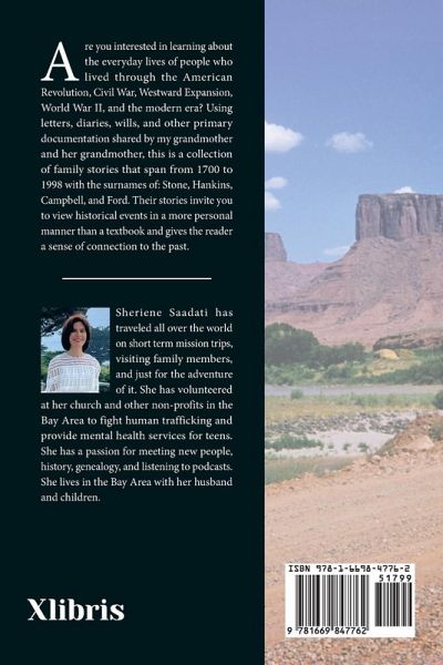 Are you interested in learning about the everyday lives of people who lived through the American Revolution, Civil War, Westward Expansion, World War II, and the modern era? Using letters, diaries, wills, and other primary documentation shared by my grandmother and her grandmother, this is a collection of family stories that span from 1700 to 1998 with the surnames of: Stone, Hankins, Campbell, Ford, and Simpson. Their stories invite you to view historical events in a more personal manner than a textbook and gives the reader a sense of connection to the past.