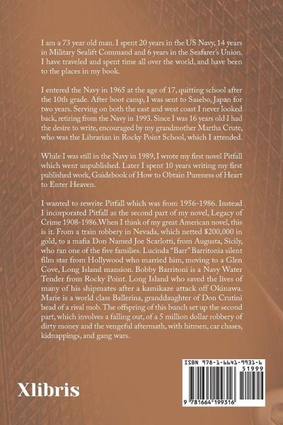 I am a 73 year old man. I spent 20 years in the US Navy, 14 years in Military Sealift Command and 6 years in the Seafarer's Union. I have traveled and spent time all over the world, and have been to the places in my book. I entered the Navy in 1965 at the age of 17, quitting school after the 10th grade. After boot camp, I was sent to Sasebo, Japan for two years. Serving on both the east and west coast I never looked back, retiring from the Navy in 1993. Since I was 16 years old I had the desire to write, encouraged by my grandmother Martha Crute, who was the Librarian in Rocky Point School, which I attended. While I was still in the Navy in 1989, I wrote my first novel Pitfall which went unpublished. Later I spent 10 years writing my first published work, Guidebook of How to Obtain Pureness of Heart to Enter Heaven. I wanted to rewrite Pitfall which was from 1956-1986. Instead I incorporated Pitfall as the second part of my novel, Legacy of Crime 1908-1986.When I think of my great American novel, this is it. From a train robbery in Nevada, which netted $200,000 in gold, to a mafia Don Named Joe Scarlotti, from Augusta, Sicily, who ran one of the five families. Lucinda "Barr" Barritonia silent film star from Hollywood who married him, moving to a Glen Cove, Long Island mansion. Bobby Barritoni is a Navy Water Tender from Rocky Point. Long Island who saved the lives of many of his shipmates after a kamikaze attack off Okinawa. Marie is a world class Ballerina, granddaughter of Don Crutini head of a rival mob. The offspring of this bunch set up the second part, which involves a falling out, of a 5 million dollar robbery of dirty money and the vengeful aftermath, with hitmen, car chases, kidnappings, and gang wars.