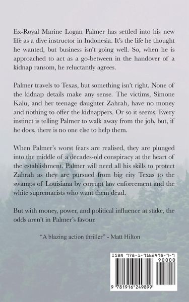 Ex-Royal Marine Logan Palmer has settled into his new life as a dive instructor in Indonesia. It's the life he thought he wanted, but business isn't going well. So, when he is approached to act as a go-between in the handover of a kidnap ransom, he reluctantly agrees. Palmer travels to Texas, but something isn't right. None of the kidnap details make any sense. The victims, Simone Kalu, and her teenage daughter Zahrah, have no money and nothing to offer the kidnappers. Or so it seems. Every instinct is telling Palmer to walk away from the job, but, if he does, there is no one else to help them. When Palmer's worst fears are realised, they are plunged into the middle of a decades-old conspiracy at the heart of the establishment. Palmer will need all his skills to protect Zahrah as they are pursued from big city Texas to the swamps of Louisiana by corrupt law enforcement and the white supremacists who want them dead. But with money, power, and political influence at stake, the odds aren't in Palmer's favour.