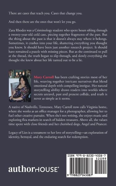 Mary Carroll has been crafting stories most of her life, weaving together intricate narratives that blend emotional depth with compelling intrigue. Her natural storytelling ability draws readers into worlds where secrets unravel, past and present collide, and truth is never as simple as it seems. A native of Nashville, Tennessee, Mary Carroll now calls Virginia home, where she works as an office manager for a photographer, allowing her to fuel other creative pursuits. When she's not writing, she enjoys music and exploring flea markets in search of hidden treasures. Above all, she values time spent with close friends and her cherished dogs, Angel and Prancer. Legacy of Lies is a testament to her love of storytelling-an exploration of identity, betrayal, and the enduring search for redemption.