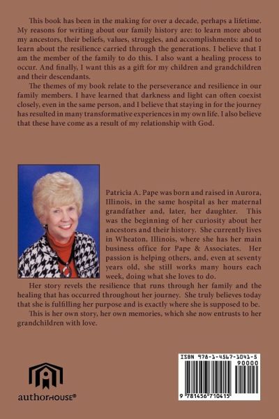 This book has been in the making for over a decade, perhaps a lifetime. My reasons for writing about our family history are: to learn more about my ancestors, their beliefs, values, struggles, and accomplishments: and to learn about the resilience carried through the generations. I believe that I am the member of the family to do this. I also want a healing process to occur. And finally, I want this as a gift for my children and grandchildren and their descendants. The themes of my book relate to the perseverance and resilience in our family members. I have learned that darkness and light can often coexist closely, even in the same person, and I believe that staying in for the journey has resulted in many transformative experiences in my own life. I also believe that these have come as a result of my relationship with God.