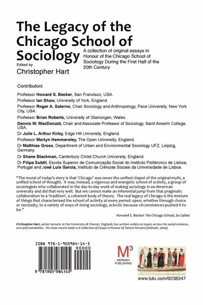A collection of original essays celebrating the legacy of the Chicago School of Sociology during the first half of the 20th century. Contributors - Professor Howard S. Becker, San Francisco, USA. Professor Ian Shaw, University of York, England. Professor Roger A. Salerno, Chair Sociology and Anthropology, Pace University, New York City, USA. Professor Brian Roberts, University of Glamorgan, Wales. Dennis W. MacDonald, Chair and Associate Professor of Sociology, Saint Anselm College, USA. Dr Julie L. Arthur Kirby, Edge Hill University, England. Professor Martyn Hammersley, The Open University, England. Dr Matthias Gross, UFZ, Permoserstr. Leipzig, Germany. Dr Shane Blackman, Canterbury Christ Church University, England. Dr Filipa Subtil, Instituto Politécnico de Lisboa, Portugal and José Luís Garcia, Instituto de Ciências Sociais da Universidade de Lisboa.