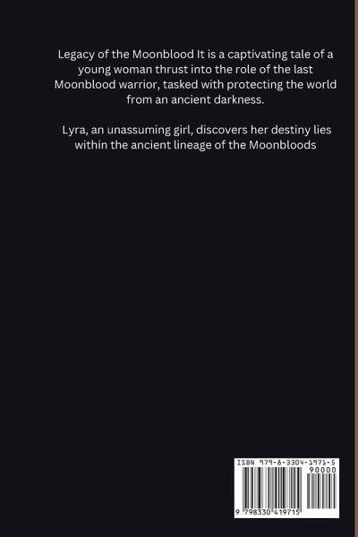 Legacy of the Moonblood It is a captivating tale of a young woman thrust into the role of the last Moonblood warrior, tasked with protecting the world from an ancient darkness. Lyra, an unassuming girl, discovers her destiny lies within the ancient lineage of the Moonbloods. With the guidance of her mentor, Elara, she embarks on a perilous journey to awaken her dormant power and confront the rising threat of the Rogue Alpha. Key Points: Awakening Power: Witness Lyra's transformation as she unlocks the secrets of her heritage and embraces the power of the Moonbloods. Forbidden Knowledge: Delve into a world of ancient rituals, forgotten lore, and the hidden Moonstone Nexus, a repository of immense lunar power. Epic Battles: Experience thrilling encounters as Lyra faces monstrous creatures and the relentless pursuit of the Rogue Alpha. But Lyra isn't alone. Aided by her loyal wolf spirit and the unwavering spirit of her ancestors, she must find the legendary Moonstone Blade, the only weapon capable of defeating the encroaching darkness. Legacy of the Moonblood is a captivating blend of fantasy and adventure, perfect for readers who enjoy tales of heroism, self-discovery, and the enduring battle between light and darkness. Will Lyra rise to the challenge and fulfill her destiny? Dive into Book One today and discover the legacy that awaits!
