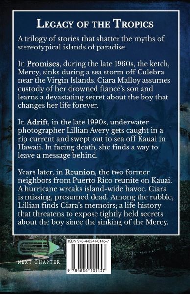 A trilogy of stories that shatter the myths of stereotypical islands of paradise. In Promises, during the late 1960s, the ketch, Mercy, sinks during a sea storm off Culebra near the Virgin Islands. Ciara Malloy assumes custody of her drowned fiancé's son and learns a devastating secret about the boy that changes her life forever. In Adrift, in the late 1990s, underwater photographer Lillian Avery gets caught in a rip current and swept out to sea off Kauai in Hawaii. In facing death, she finds a way to leave a message behind. Years later, in Reunion, the two former neighbors from Puerto Rico reunite on Kauai. A hurricane wreaks island-wide havoc. Ciara is missing, presumed dead. Among the rubble, Lillian finds Ciara's memoirs; a life history that threatens to expose tightly held secrets about the boy since the sinking of the Mercy.