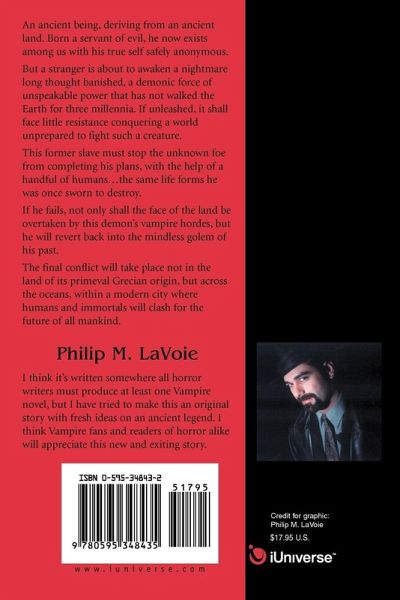An ancient being, deriving from an ancient land. Born a servant of evil, he now exists among us with his true self safely anonymous. But a stranger is about to awaken a nightmare long thought banished, a demonic force of unspeakable power that has not walked the Earth for three millennia. If unleashed, it shall face little resistance conquering a world unprepared to fight such a creature. This former slave must stop the unknown foe from completing his plans, with the help of a handful of humans...the same life forms he was once sworn to destroy. If he fails, not only shall the face of the land be overtaken by this demon's vampire hordes, but he will revert back into the mindless golem of his past. The final conflict will take place not in the land of its primeval Grecian origin, but across the oceans, within a modern city where humans and immortals will clash for the future of all mankind.