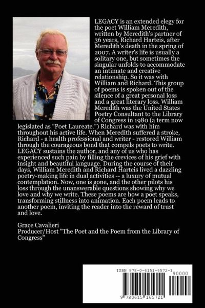 LEGACY is an extended elegy for the poet William Meredith, written by Meredith's partner of 36 years, Richard Harteis, after Meredith's death in the spring of 2007. This group of poems is spoken out of the silence of a great personal loss and a great literary loss. When Meredith, former U.S. Poet Laureate suffered a stroke, Richard - a health professional and writer - restored William through the courageous bond that compels poets to write. LEGACY sustains the author, and any of us who has experienced such pain. During the course of their days, William Meredith and Richard Harteis lived a dazzling poetry-making life in dual activities -- a luxury of mutual contemplation. Now, one is gone, and the other pilots his loss through the unanswerable questions showing why we love and why we write. These poems are how a poet speaks, transforming stillness into animation. Each poem leads to another poem, inviting the reader into the reward of trust and love. Grace Cavalieri