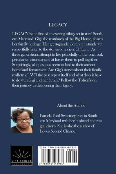 LEGACY is the first of an exciting trilogy set in rural Southern Maryland. Gigi, the matriarch of the Big House, shares her family heritage. Her great-grandchildren reluctantly, yet respectfully listen to the stories of ancient Ch'Lera. As three generations attempt to live peacefully under one roof, peculiar situations arise that forces them to pull together. Surprisingly, all questions seem to lead to their ancient homeland for answers. Are Gig's stories about their family really true? Will the past repeat itself and what does it have to do with Gigi and her family? Follow the Tolson's on their journey in discovering their legacy.