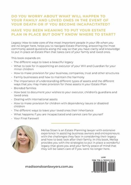 DO YOU WORRY ABOUT WHAT WILL HAPPEN TO YOUR FAMILY AND LOVED ONES IN THE EVENT OF YOUR DEATH OR IF YOU BECOME INCAPACITATED? HAVE YOU BEEN MEANING TO PUT YOUR ESTATE PLAN IN PLACE BUT DON'T KNOW WHERE TO START? Legacy: How to take care of the most important people in your life when you are no longer here, helps you to navigate Estate Planning, answering the most commonly asked questions along the way so that you have clarity and knowledge to put in place an Estate Plan that takes care of your family and loved ones. This book expands on:The different ways to leave a beautiful legacy What to look for in appointing an executor of your Will and Guardian for your minor children How to make provision for your business, companies, trust and other structures Family businesses and how to maintain the harmony The importance of understanding different types of assets and the different ways that you may make provision for these assets in your Estate Plan Blended families How best to document your wishes to your executor, children's guardians and loved ones Dealing with international assets How to make provision for children with dependency issues or disabled children The different ways to leave your loved ones their inheritance What happens if you are incapacitated and cannot care for yourself Your Final Farewell